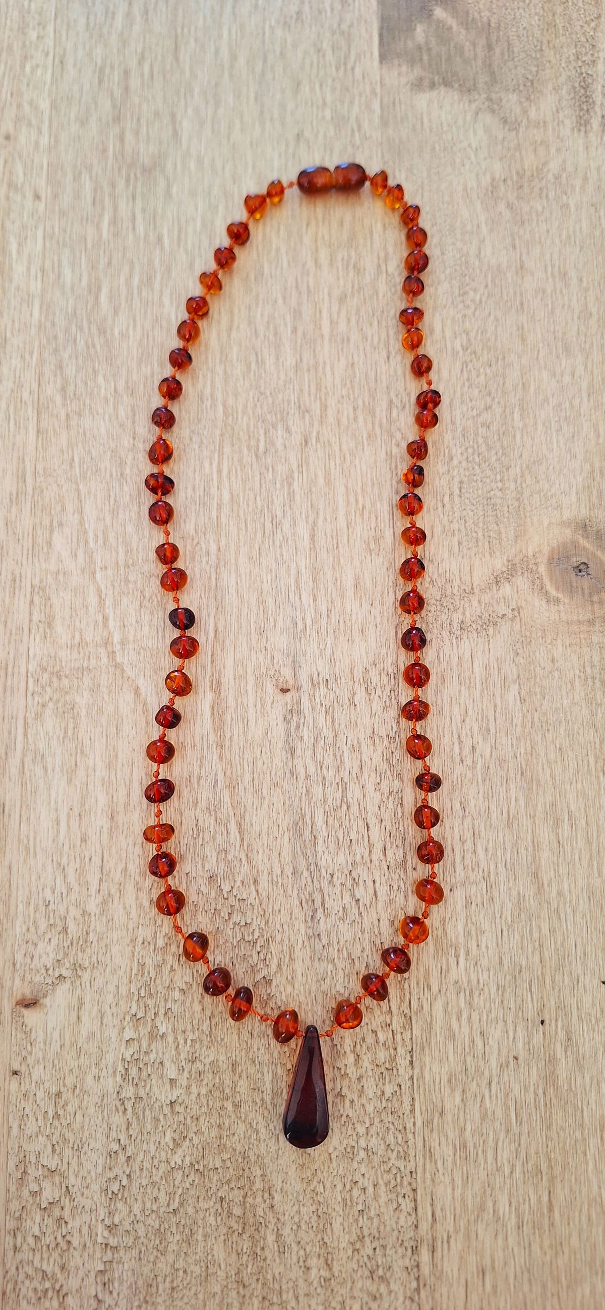 - Collar ámbar cognac con dije: Elegante y atemporal, este collar combina el cálido tono del ámbar cognac con un delicado dije, perfecto para cualquier ocasión.