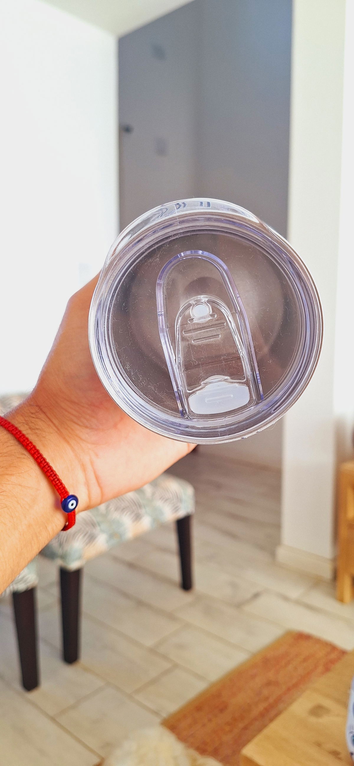 Tapa transparente con goma en el borde interno y boquilla deslizante.