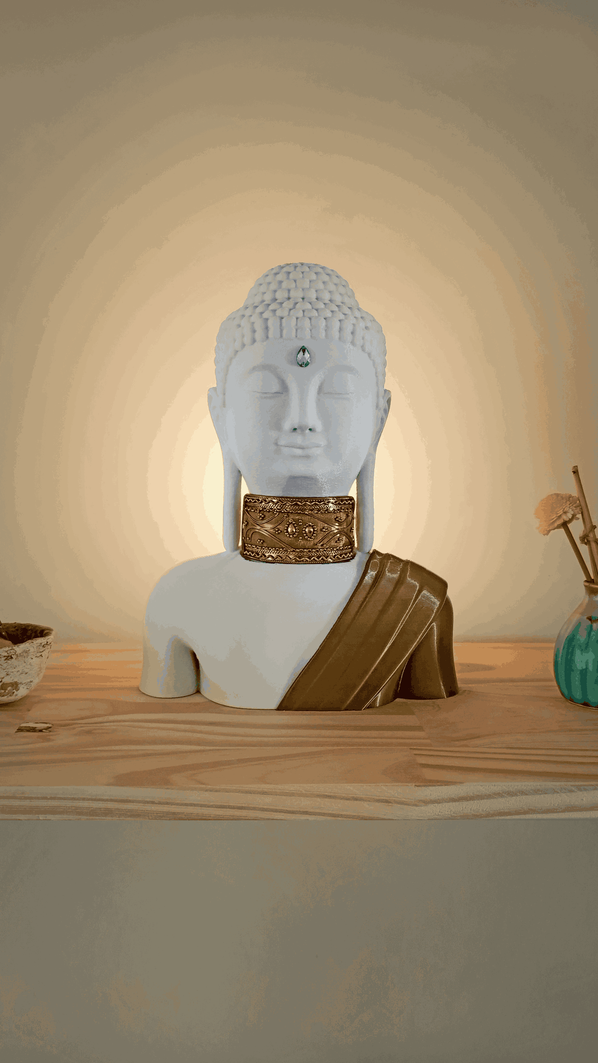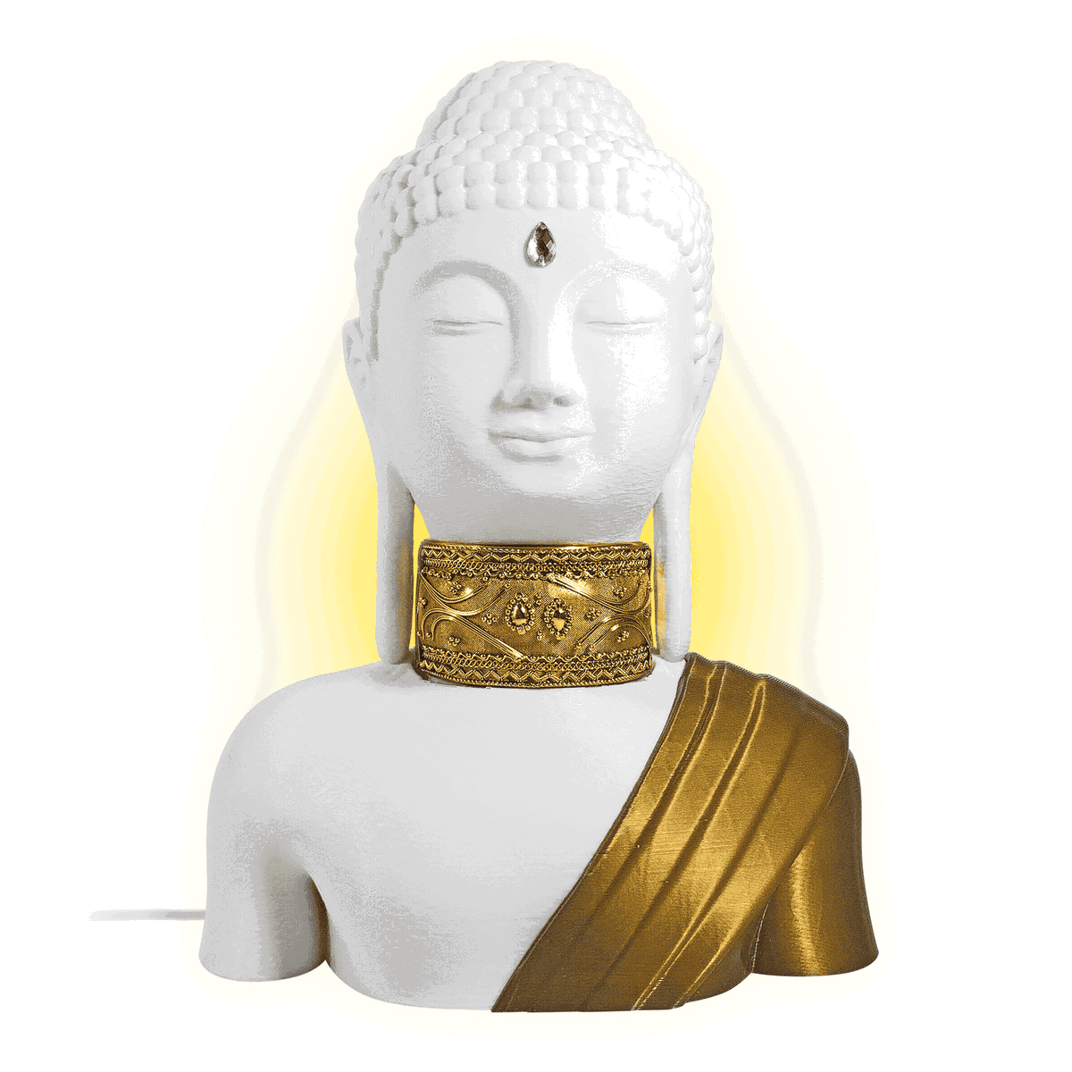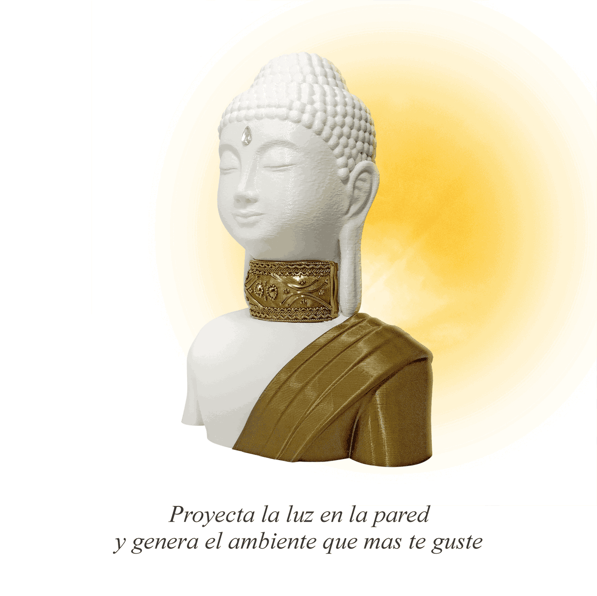 Está diseñada con la intención de colocarla cerca de la pared y de este modo al encender se proyecta la luz detras de Buda generando un ambiente cálido y de luz difusa.