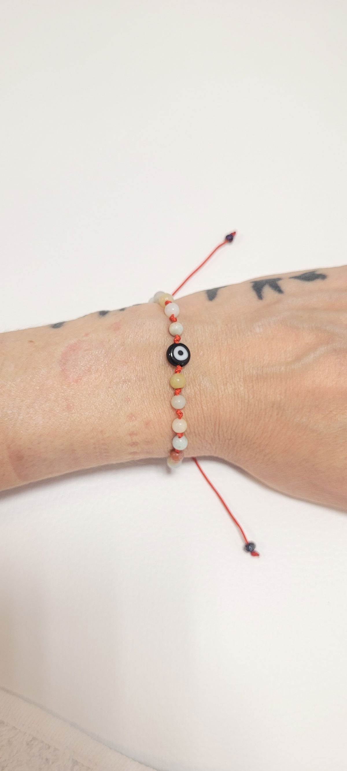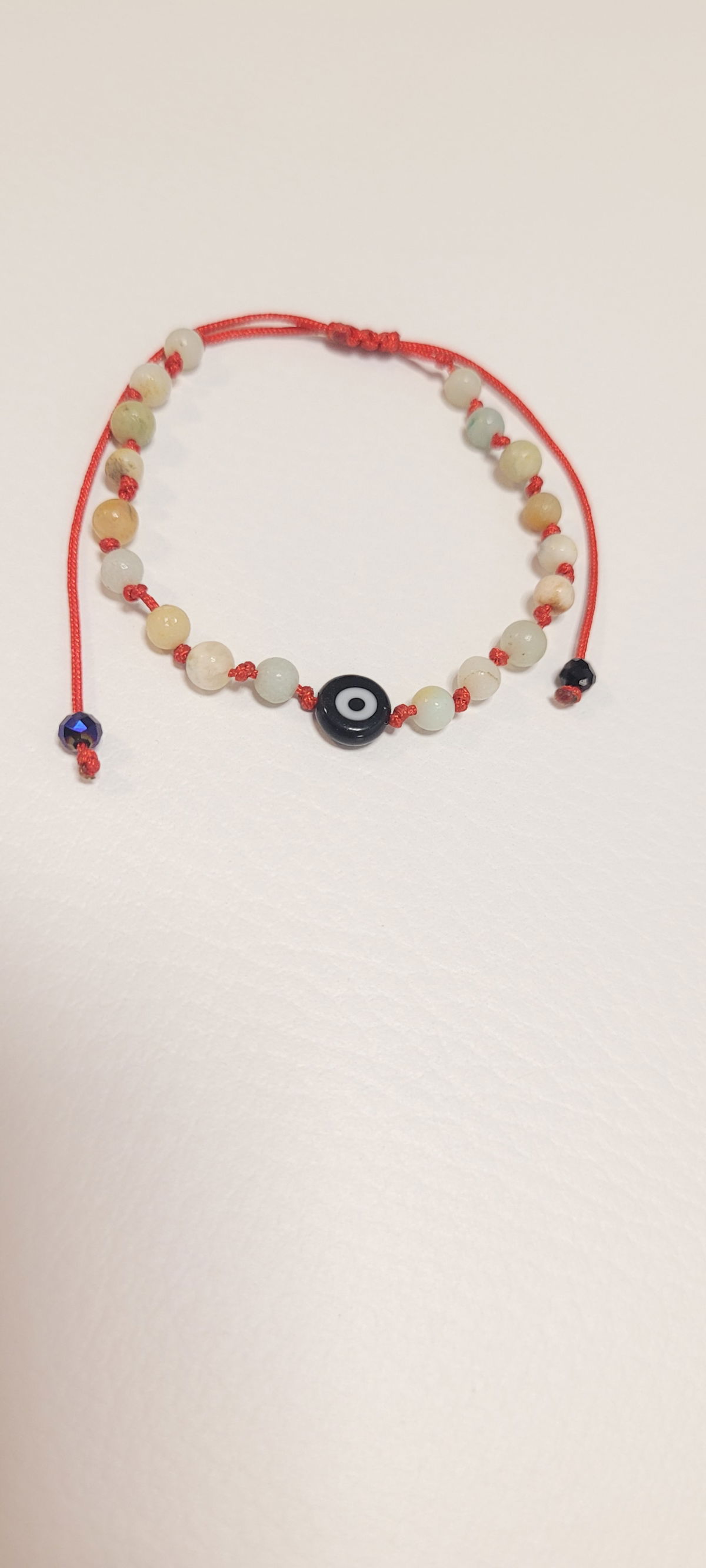 Pulsera tejida de piedra naturales, con dije de vidrio ojito... apta para el agua