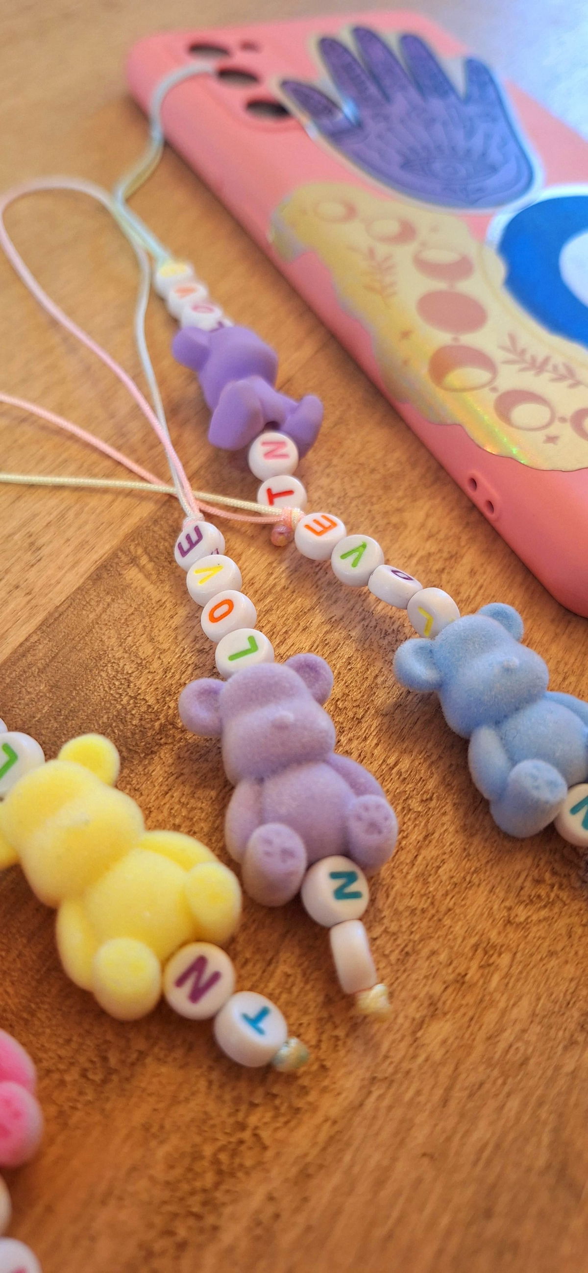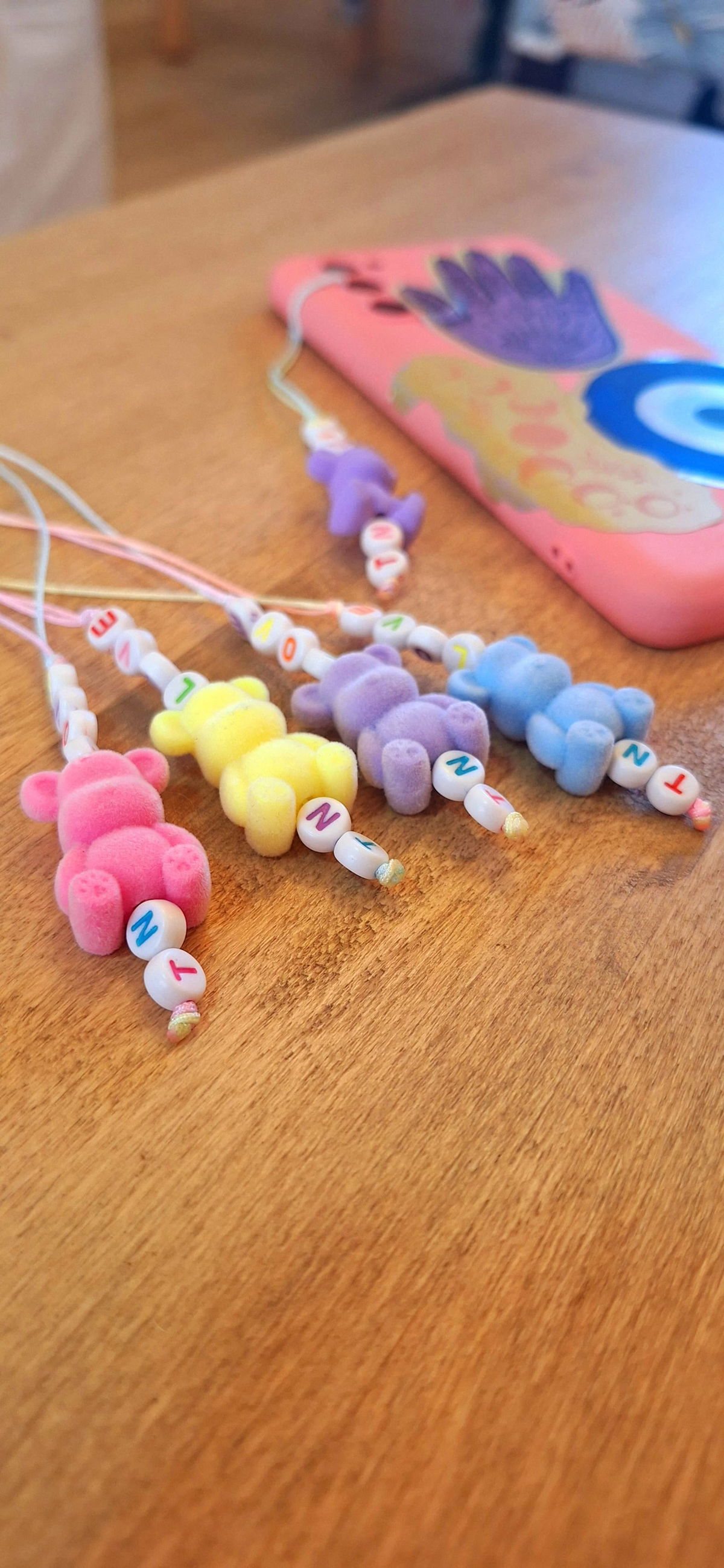 Realizado en Hilo, con un Hermoso Dije de Osito de Felpa y Cuentas de Acrilico.