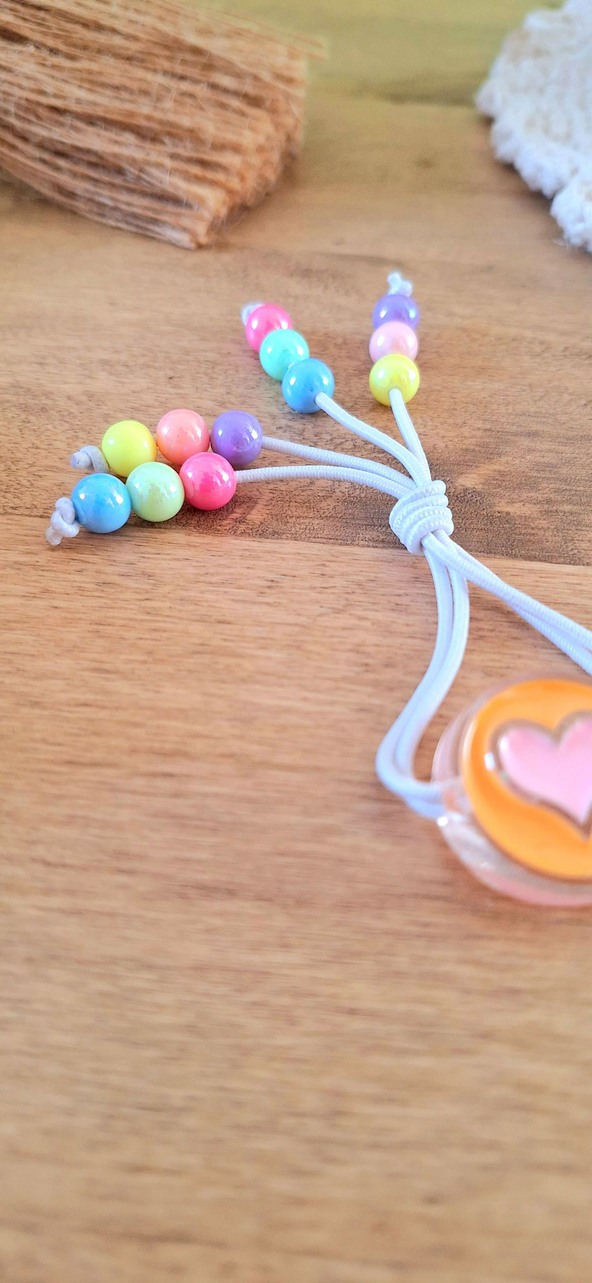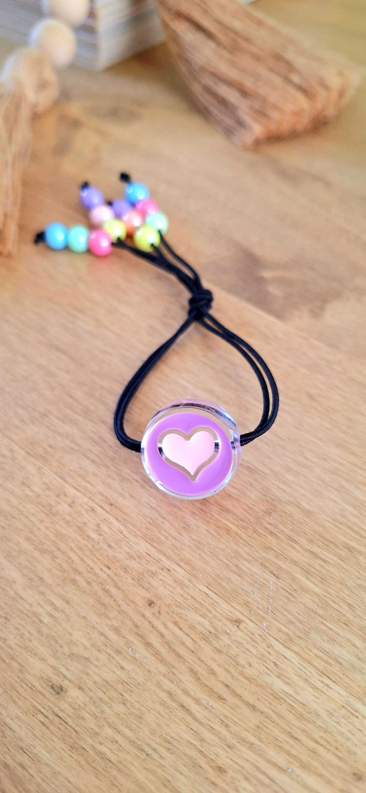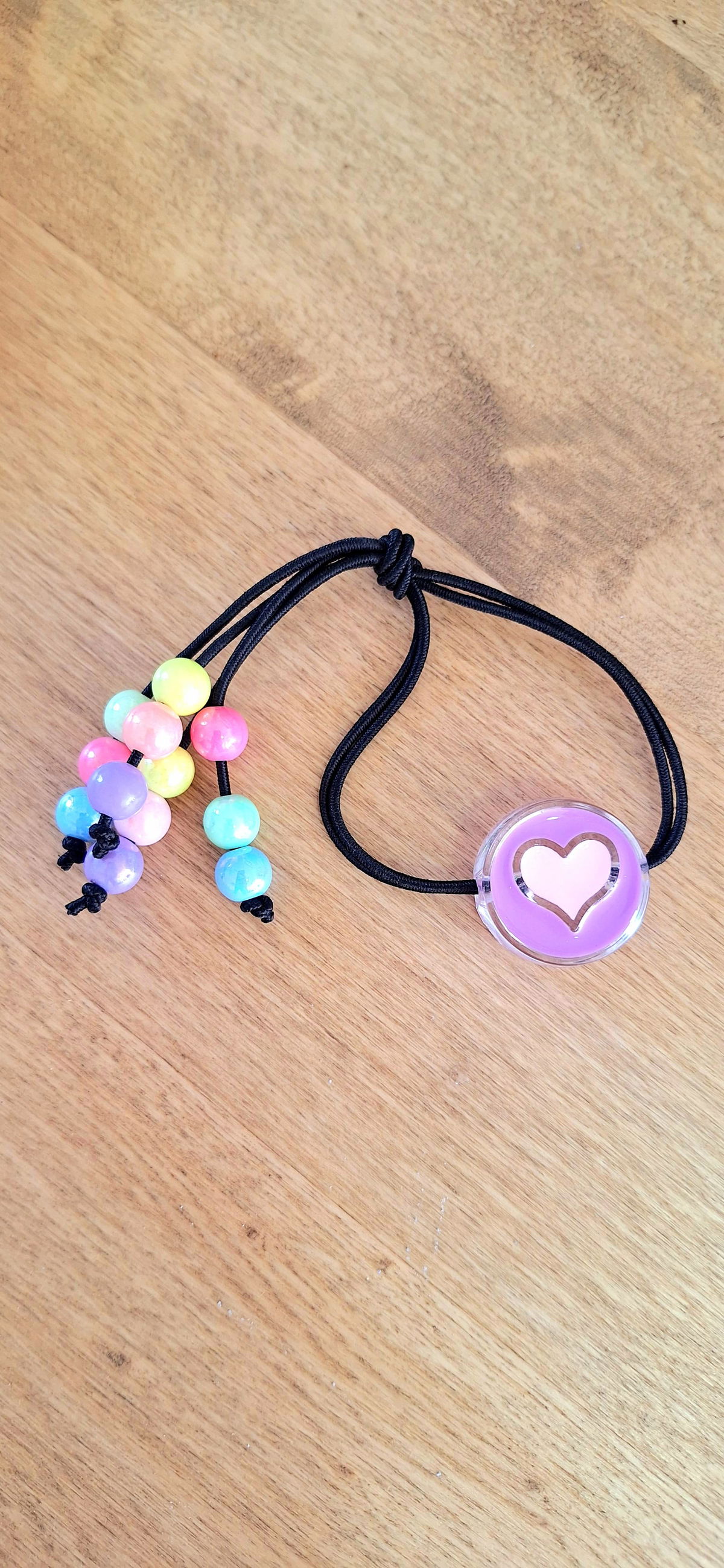 Gomita Elastica con Cuentas de Acrilico de Acrilico Metalizadas y Dije Grande de Corazón.