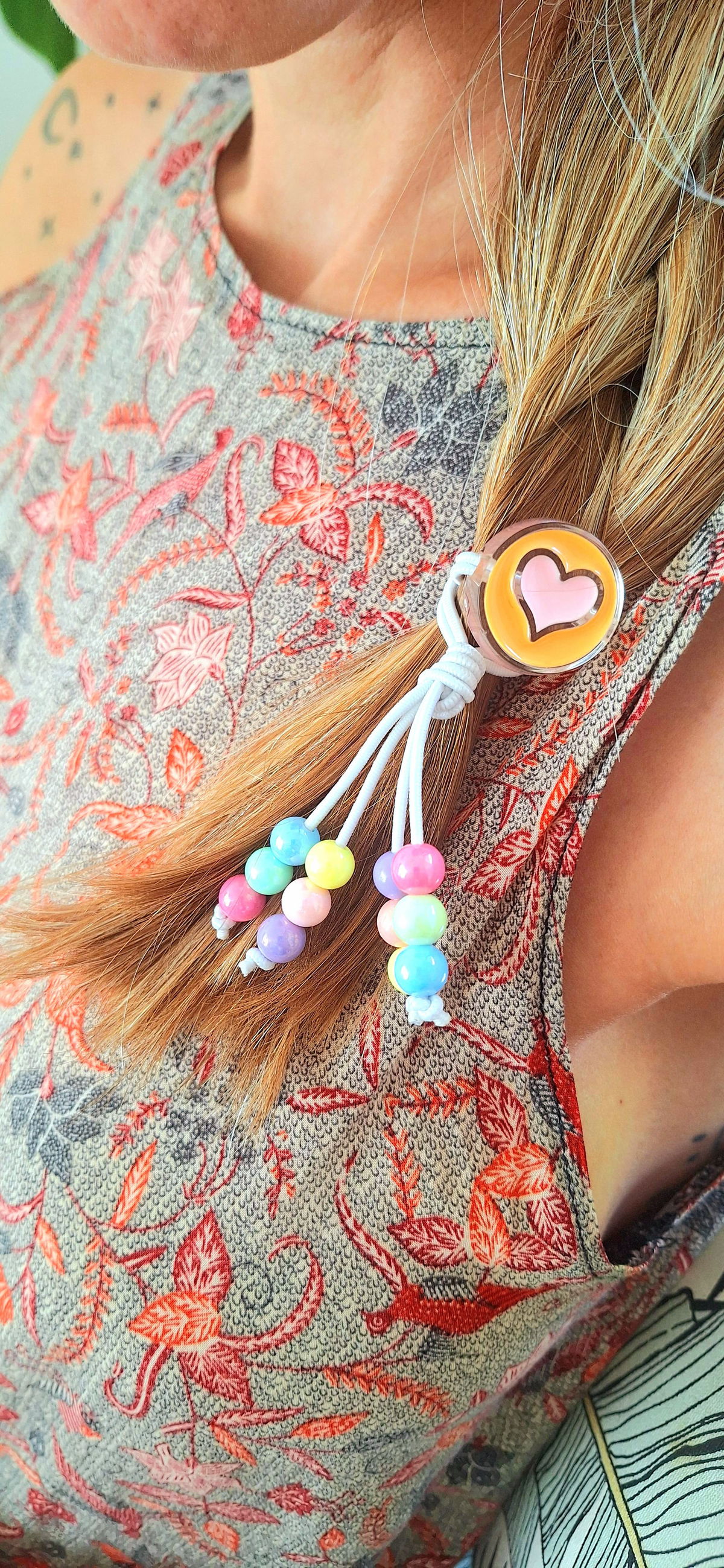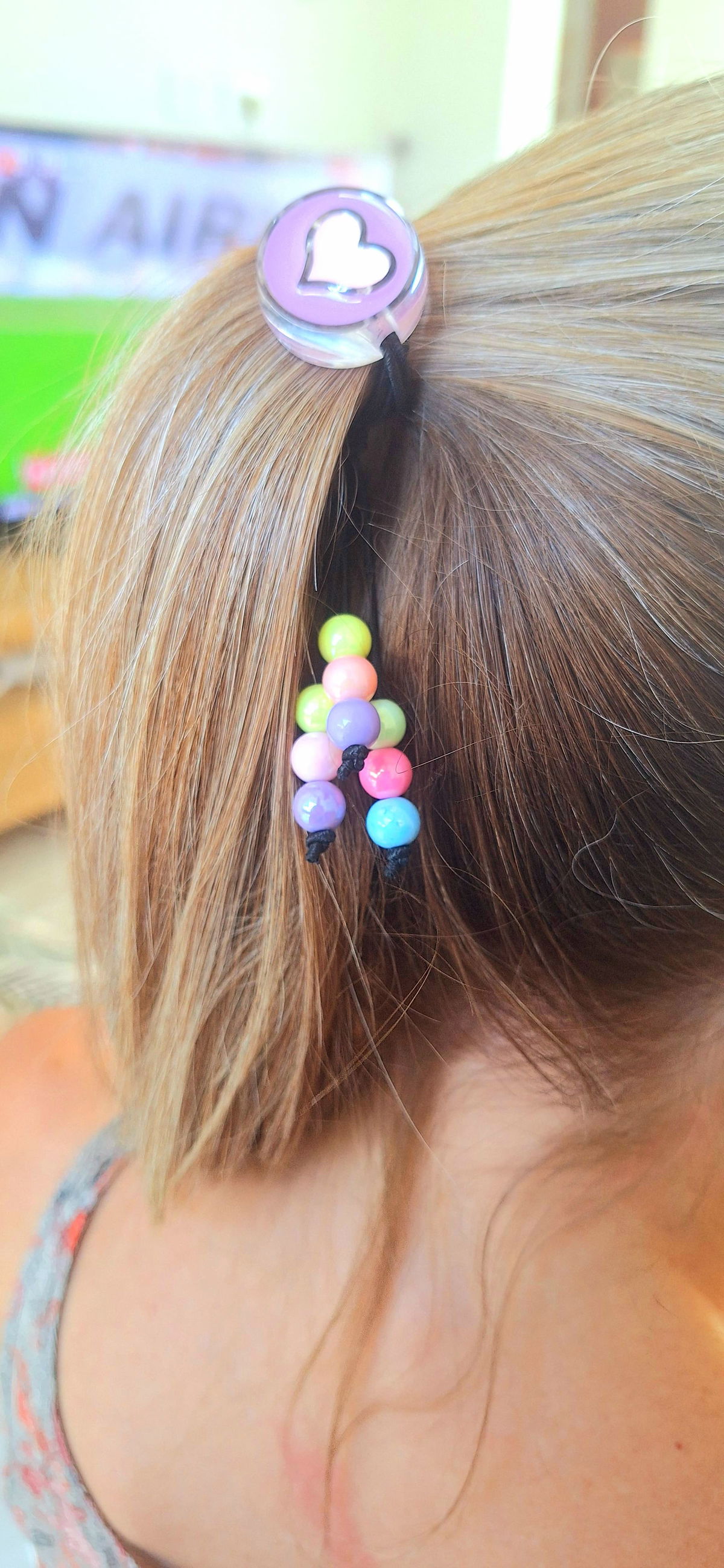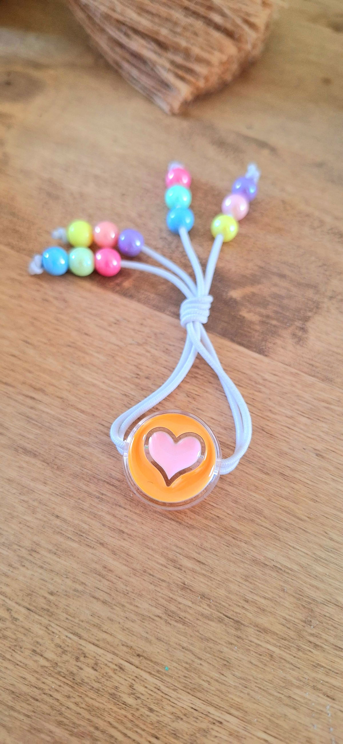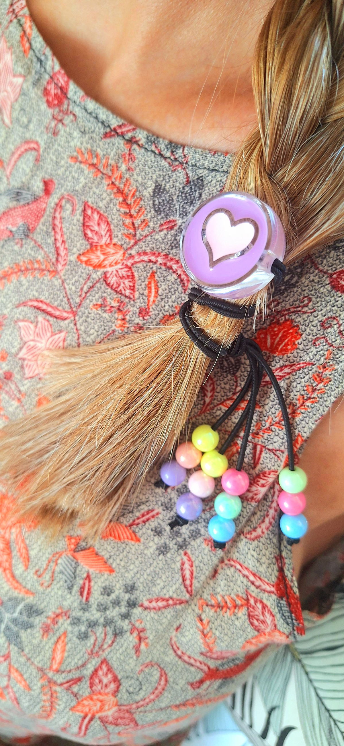 Gomita Elastica con Cuentas de Acrilico de Acrilico Metalizadas y Dije Grande de Corazón.