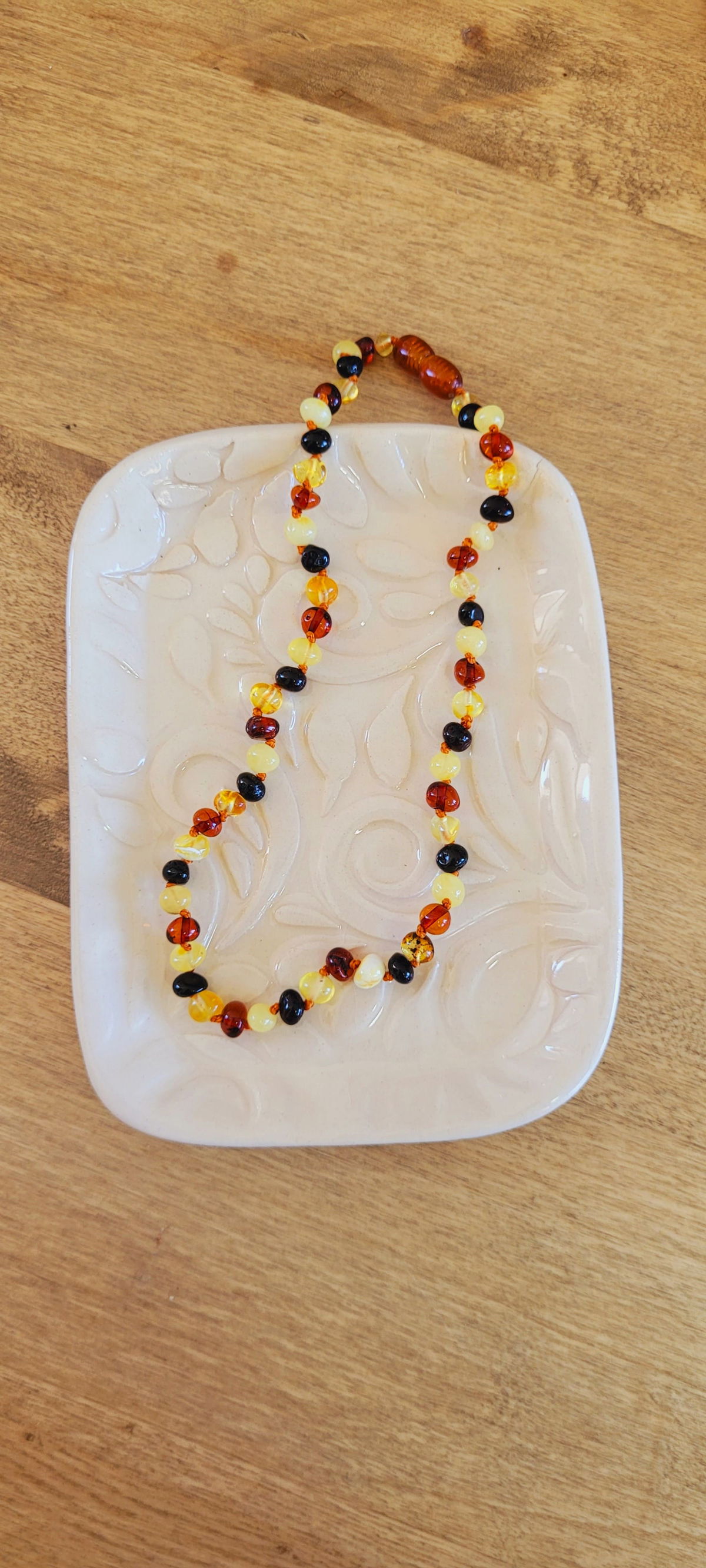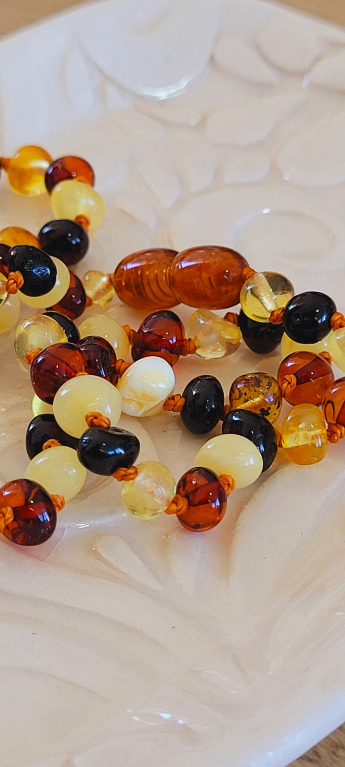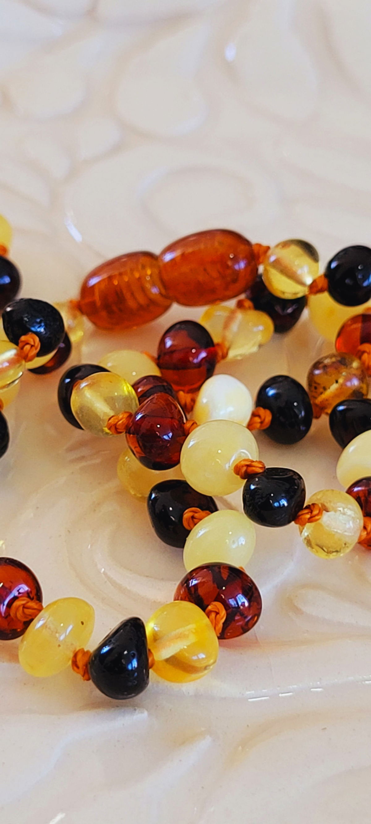 El ámbar contiene acido succinico, en contacto con el cuerpo es despedido y absorbido por nuestro torrente sanguineo, actuando como analgesico y antiinflamatorio natural; alivia dolores cervicales articulares, de artritis, calma alergias e infecciones, regula glandula tiroides y tambien estabiliza el sistema inmunologico general.