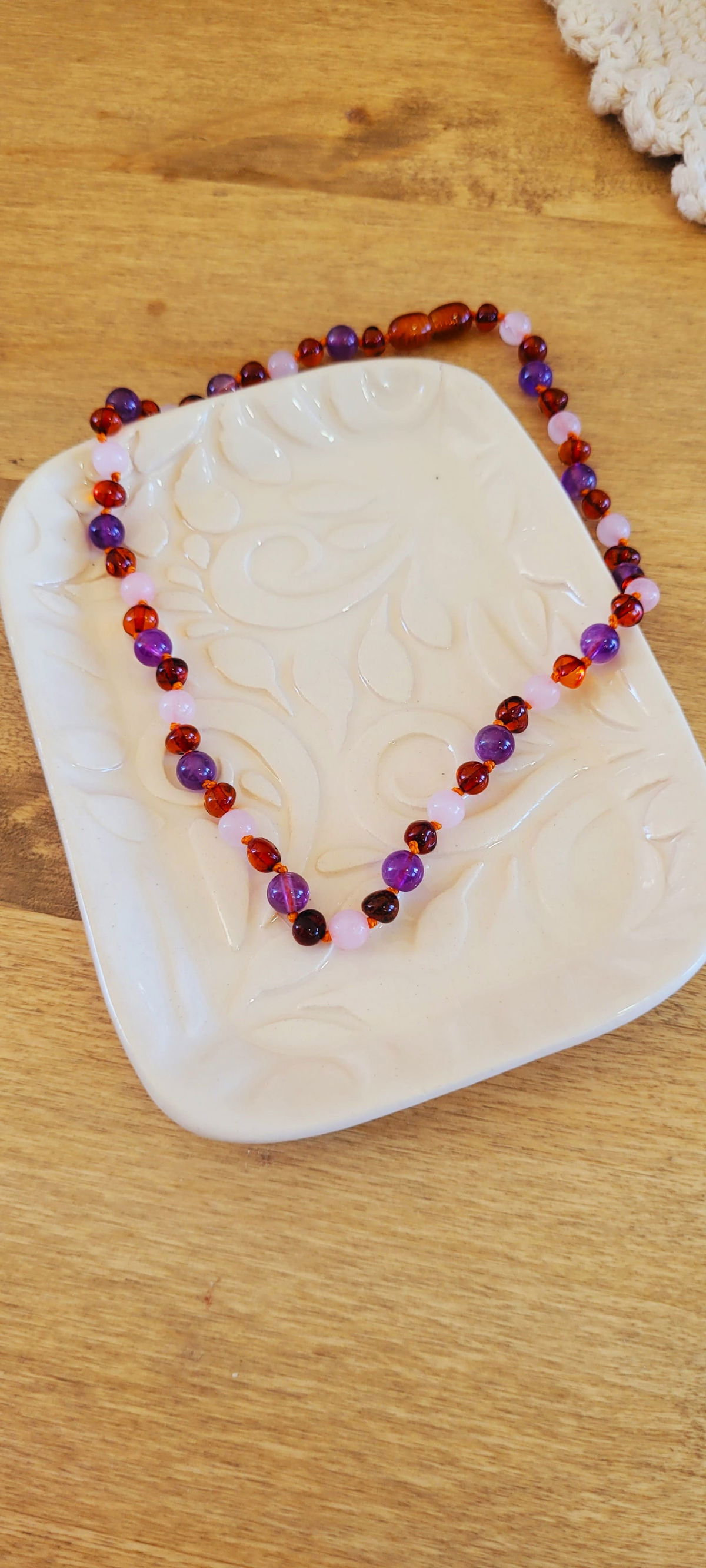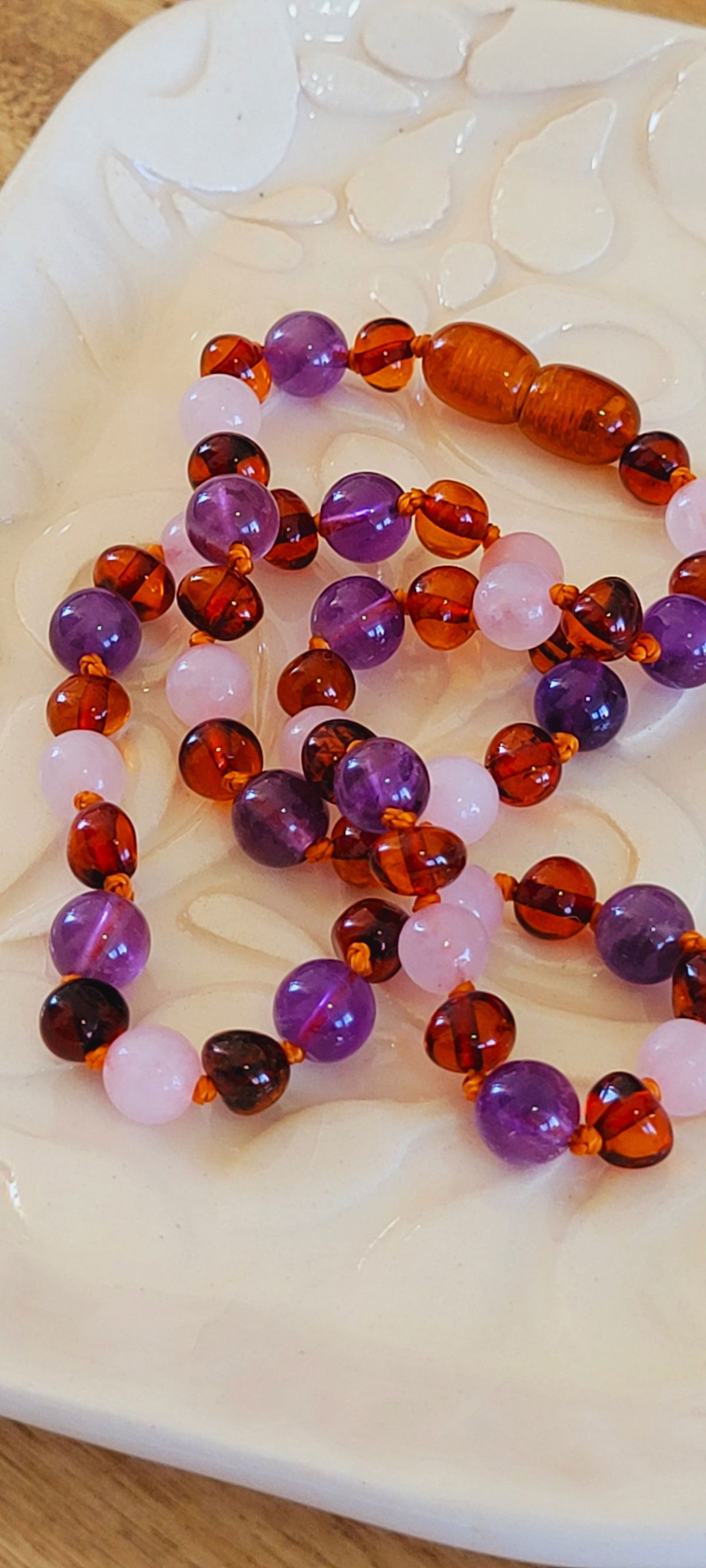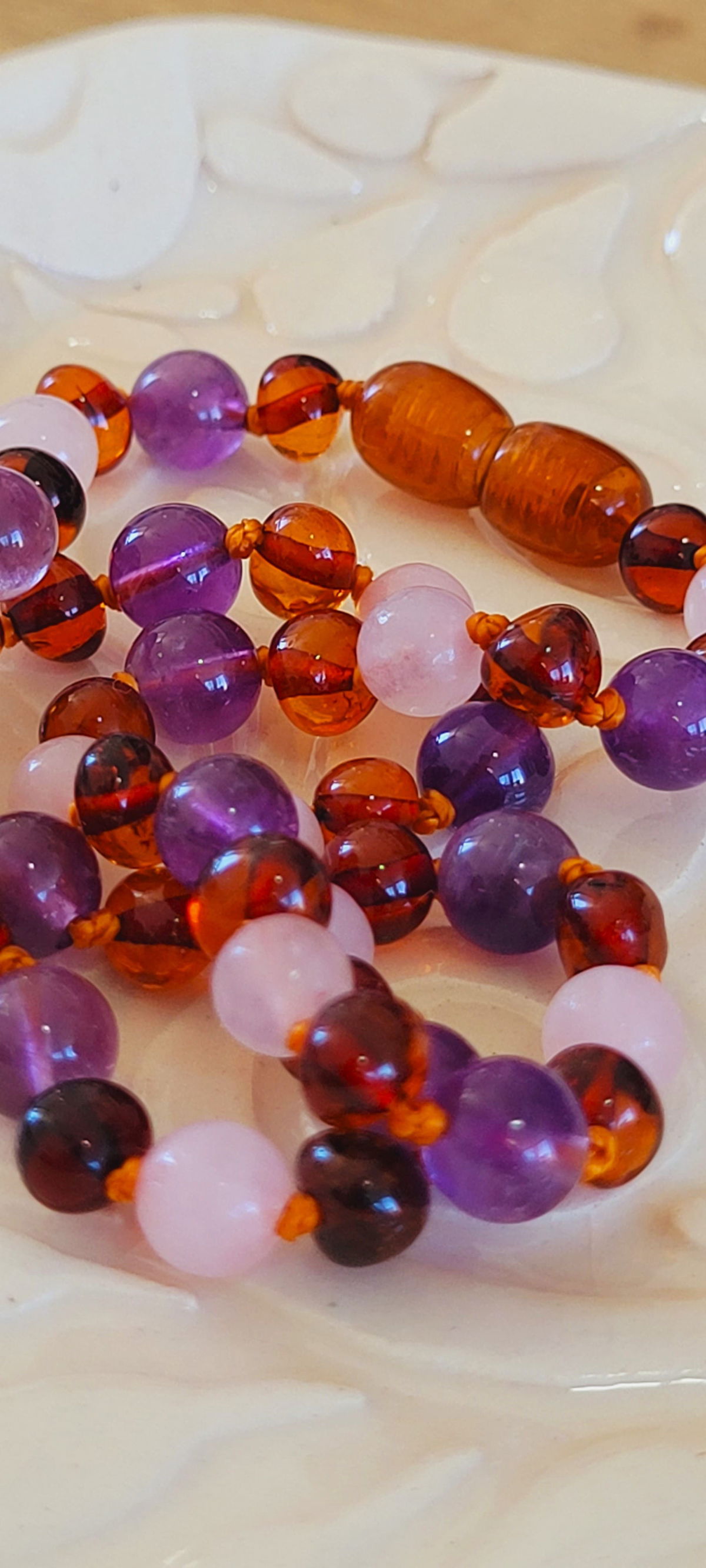 ¡Un must para los que buscan estilo y bienestar! Este collar combina la calidez del ámbar cognac con la energía positiva de la amatista y la suavidad del cuarzo rosa. Ideal para niños mayores de 5 años y adultos que quieran lucir un collar corto y elegante.