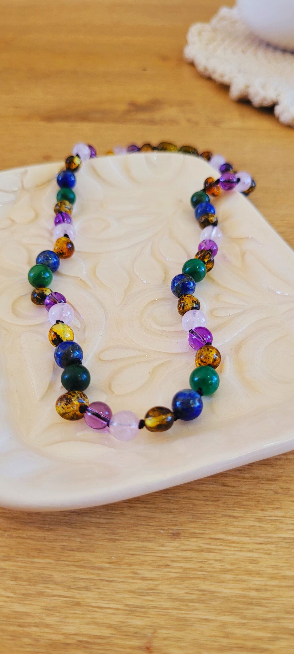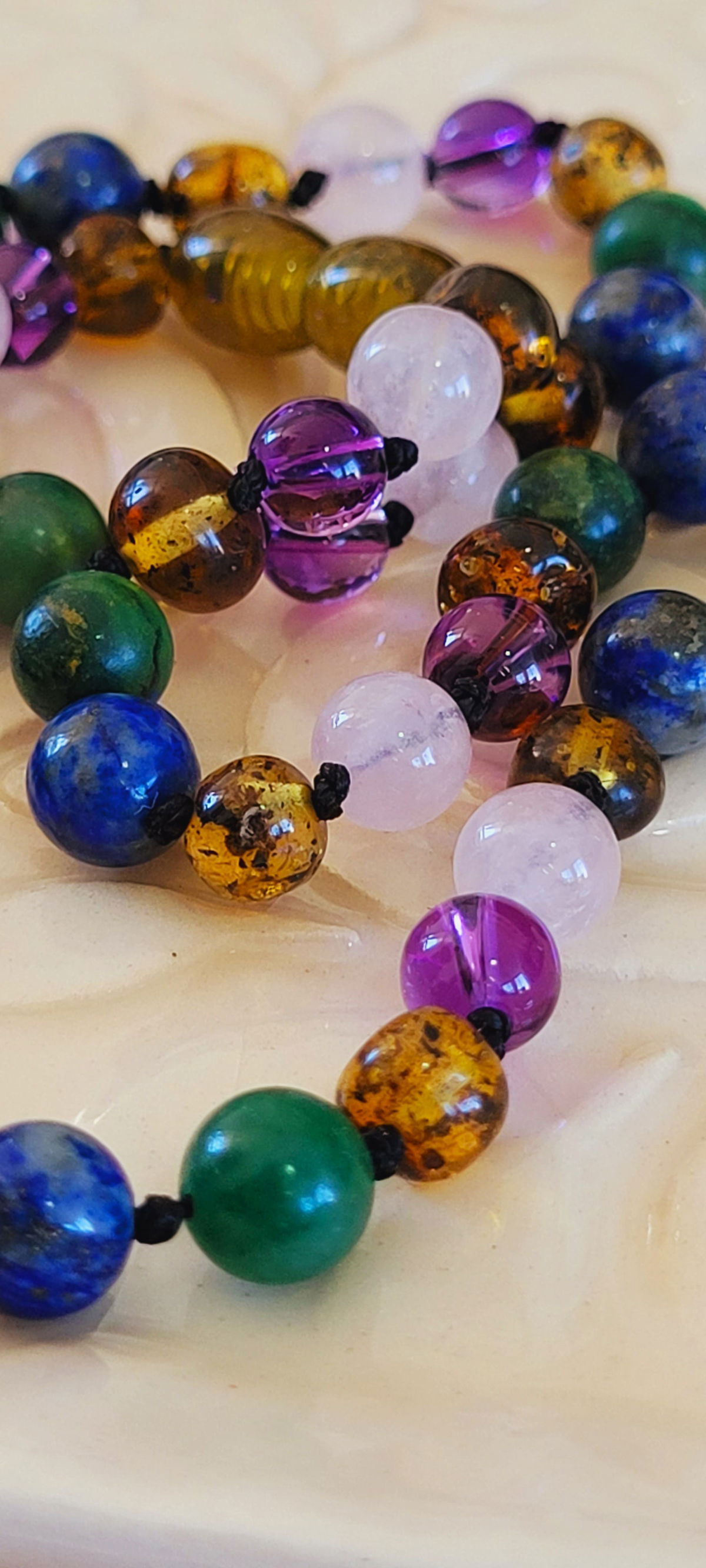 piedras: ambar verde, lapizlazuli, cuarzo rosa, amatista, jade verde.