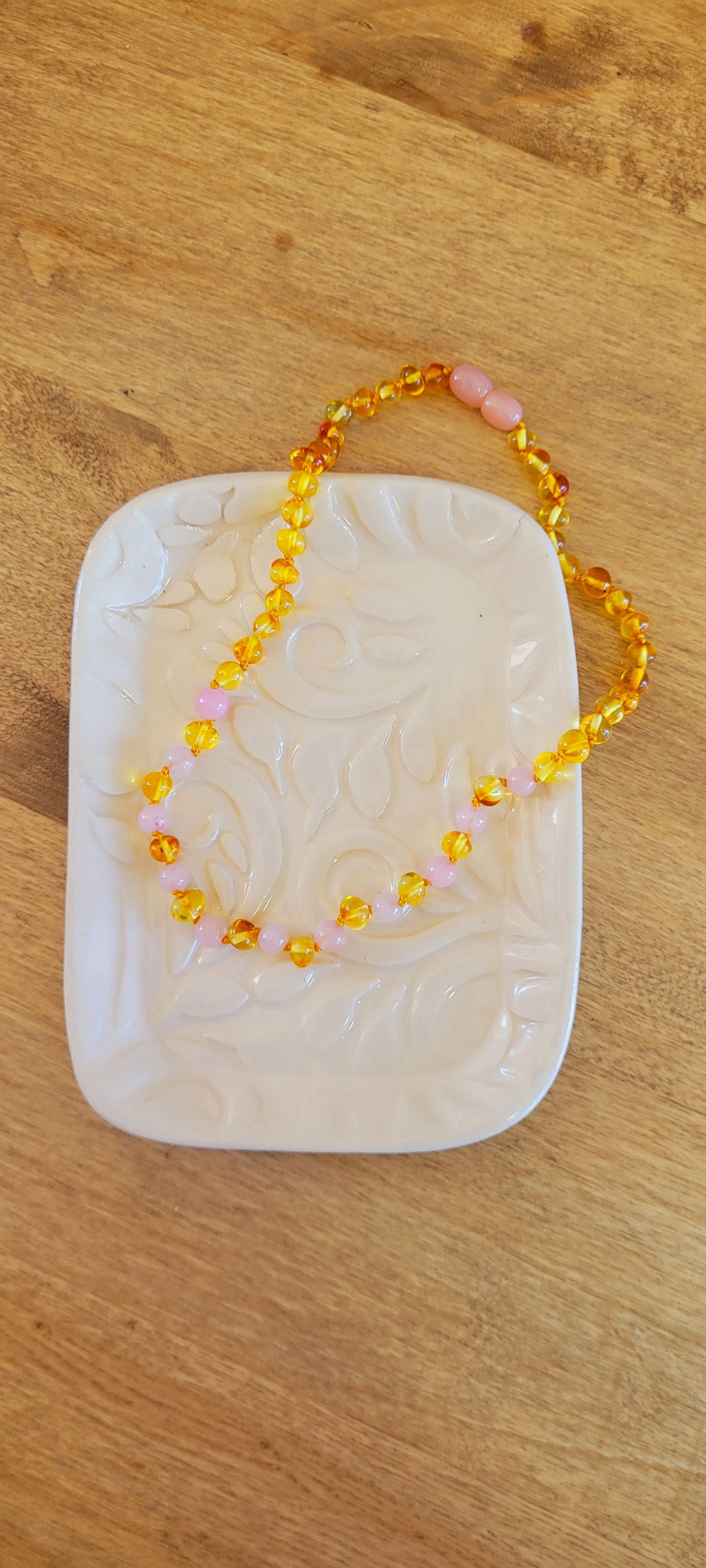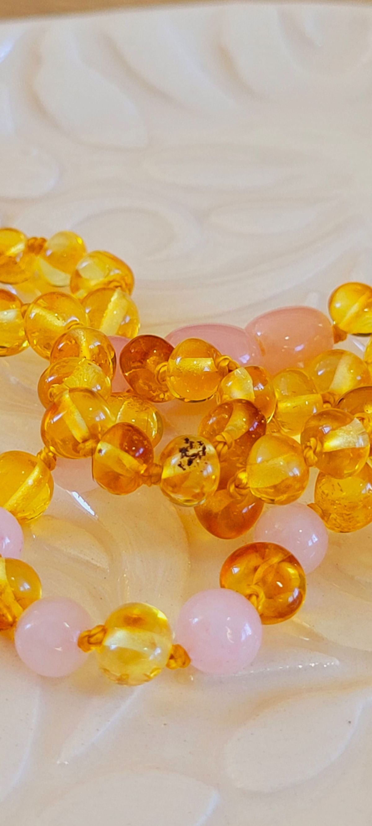 El ámbar miel, conocido como la piedra solar, se obtiene de la resina vegetal fosilizada y es famoso por sus propiedades sanadoras. Este collar, combinado con cuarzo rosa, no solo aporta belleza, sino que también tiene múltiples beneficios. El ámbar actúa como un analgésico natural, aliviando dolores y molestias, mientras que el cuarzo rosa promueve el amor y la paz interior.