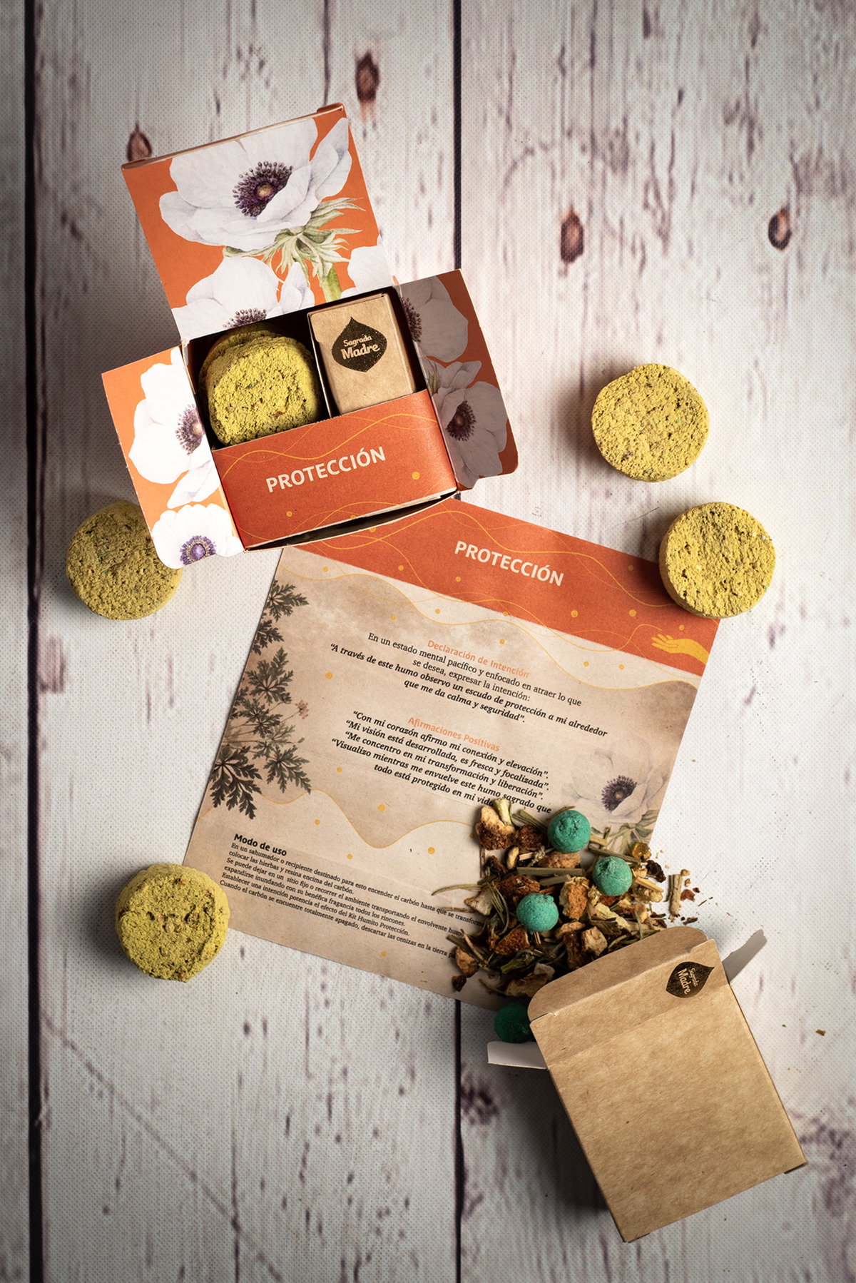 4 carbones vegetales, perlas aromáticas, hierbas aromáticas, resinas naturales, aceites esenciales y aglutinante natural.