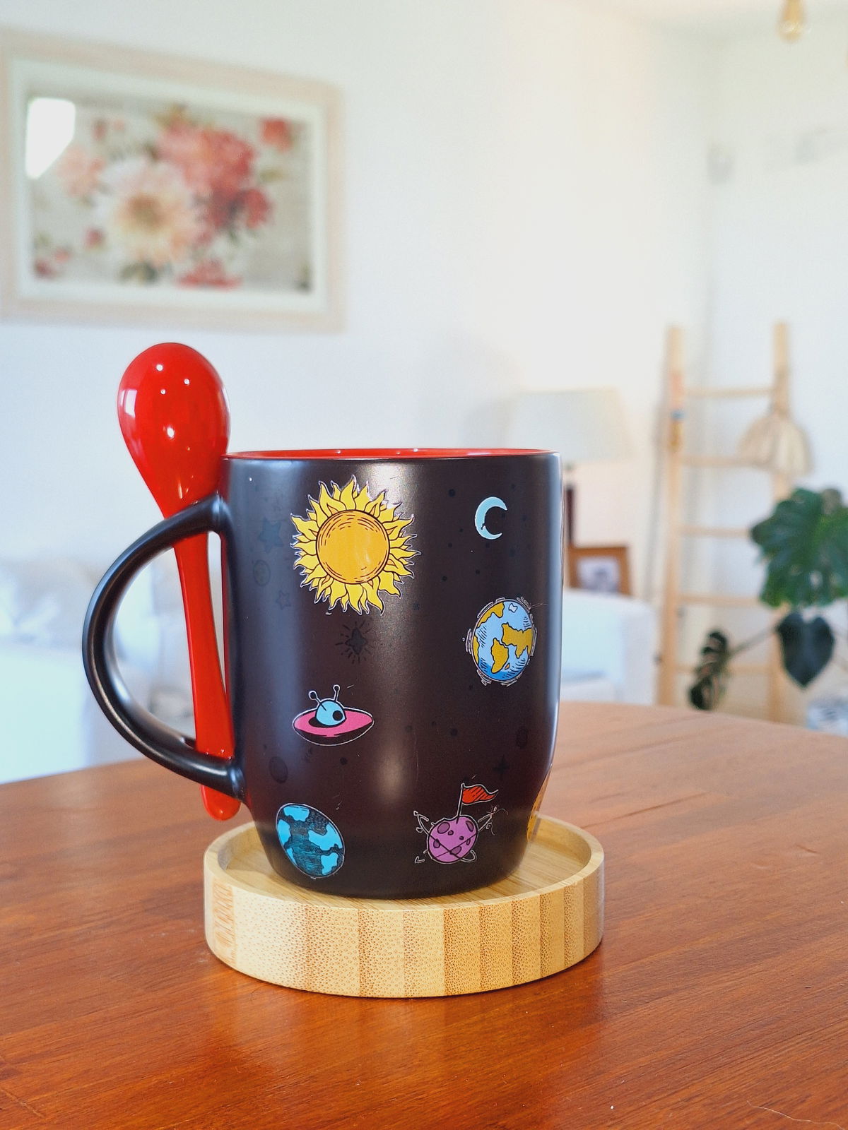 • Cuando la taza esta fría, parece negra, pero cuando se agrega agua caliente el color negro desaparece «mágicamente» y revela la imagen Estampada.