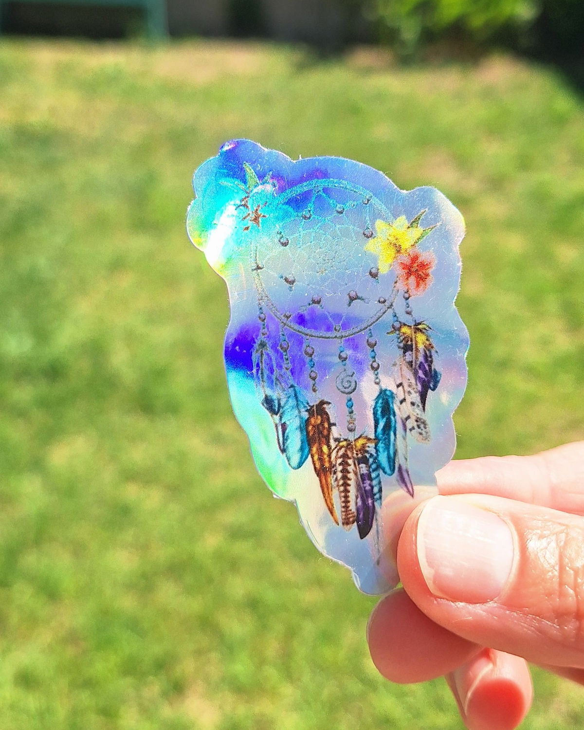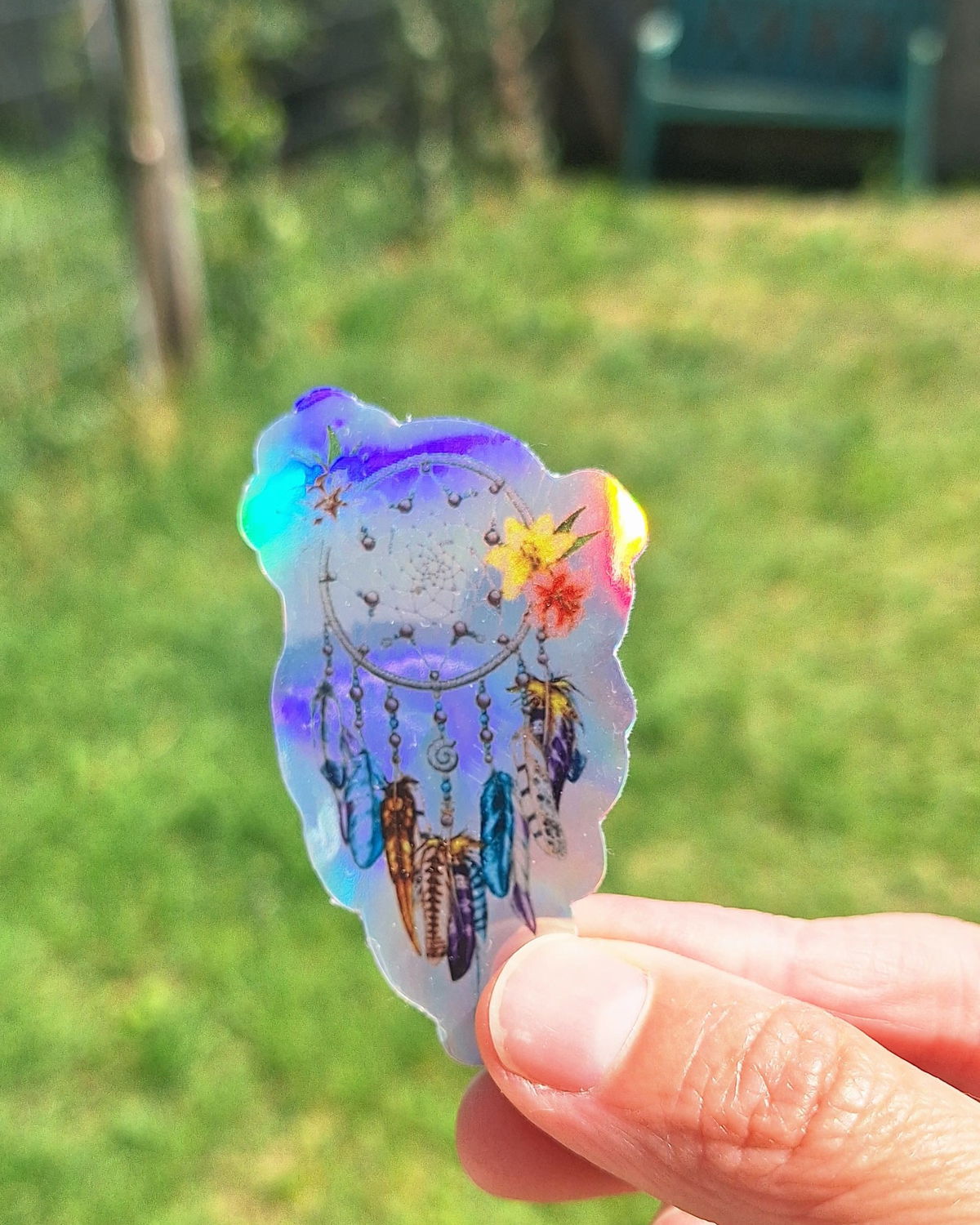 Sticker holográfico que logran un hermoso efecto arcoiris, realizado en vinilo de alta calidad, resistente al agua.