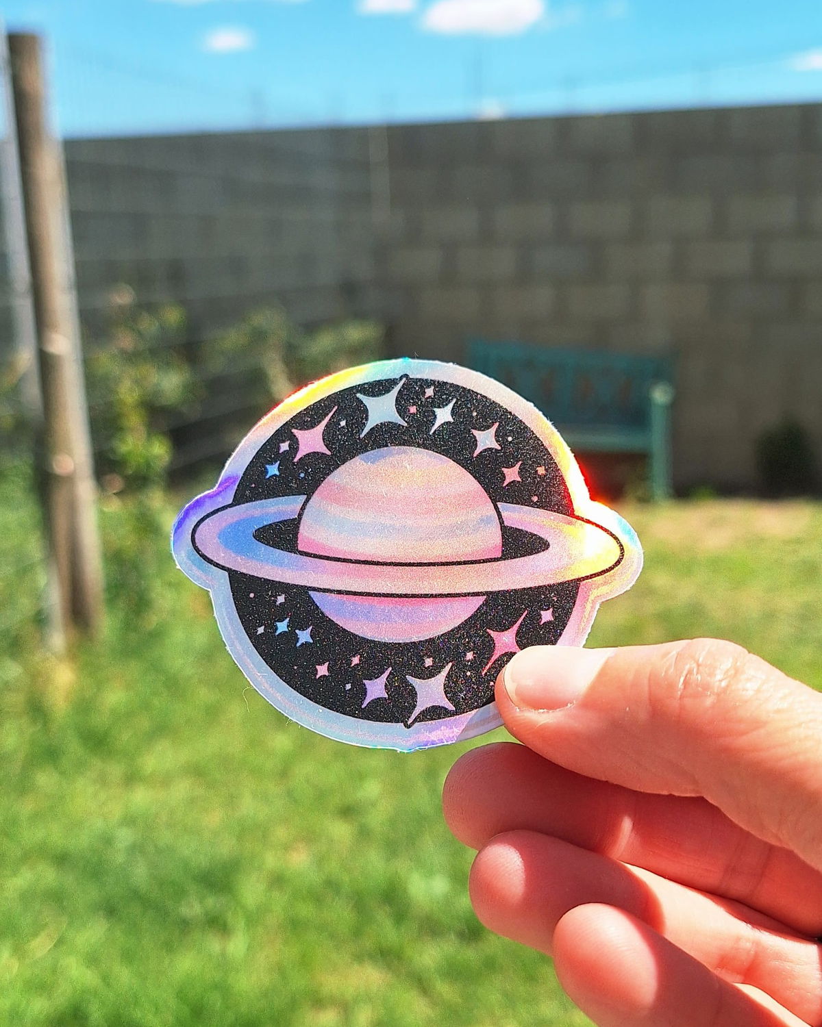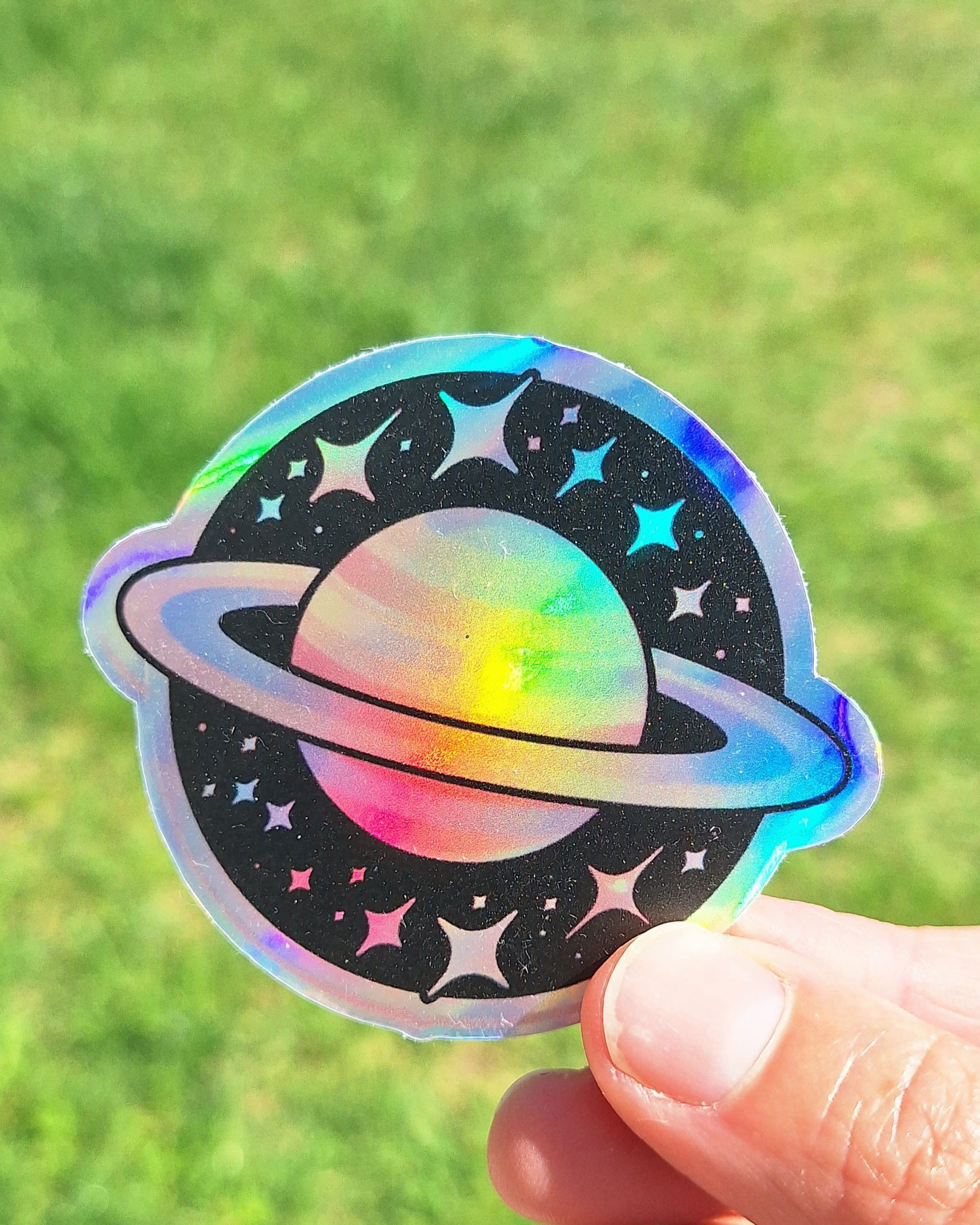 Sticker holográfico que logran un hermoso efecto arcoiris, realizado en vinilo de alta calidad, resistente al agua.